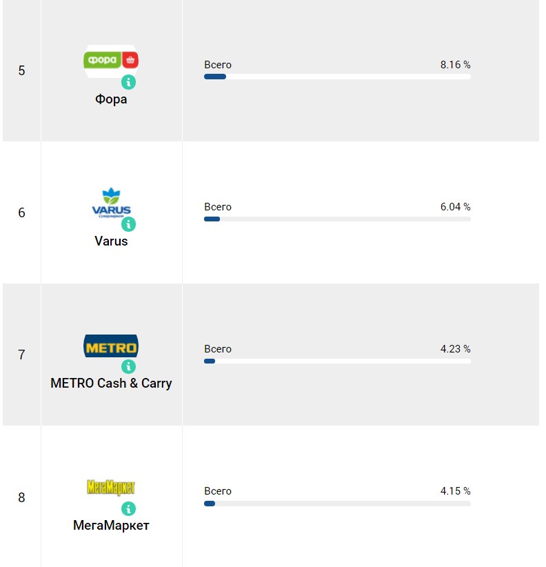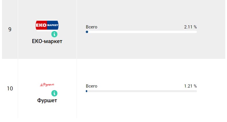 Далее рейтинг выглядит следующим образом: 6,04% голосов досталось Varus, 4,23% – Metro Cash&Carry Ukraine, 4,15% – Мегамаркет. Меньше всего голосов получили ЭКО маркет и Фуршет – 2,11% и 1,21% соответственно. Но все равно странно, что обанкротившуюся сеть до сих пор более 1% потребителей считает лучшей.