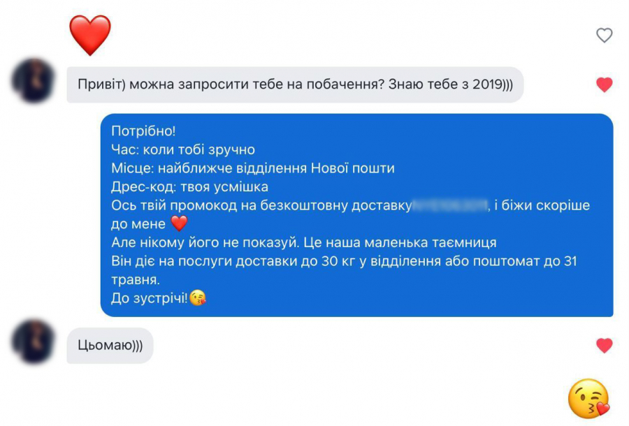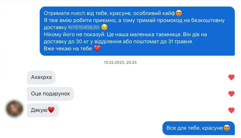 Нова пошта креативно приветствовала клиентов через сервис знакомств Tinder. По случаю Дня всех влюбленных Нова пошта создала аккаунт на сервисе и начала приглашать на свидание. В личных сообщениях приложения каждый пользователь, с которым произошла взаимная симпатия с Нова пошта – «it`s a match» – 13 и 14 февраля получили приглашение на романтическое свидание в отделении и промо-код на одну именную бесплатную доставку посылки.