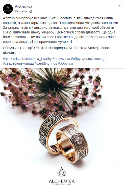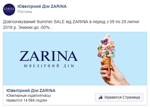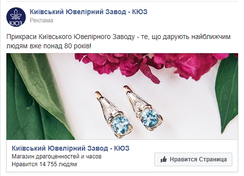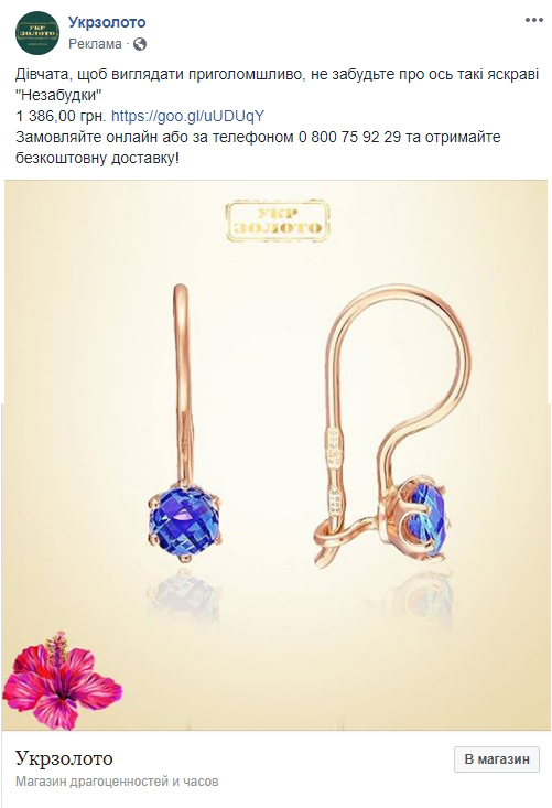 Наверное, ничто так не радует у ювелиров, как отсутствие “цену напишем в личку”. В Укрзолото выбрали максимально практичный подход к рекламе: товар, цена, ссылка в магазин. И ведь действительно подталкивает принять безотлагательное решение. Впрочем, более типичное для сегмента “до -50% скидки”, конкурс “подпишись, отметь, получи подвеску”, тоже присутствуют.