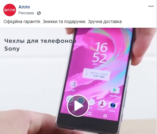 У АЛЛО выделяют в рекламном объявлении три ключевых преимущества “Официальная гарантия. Скидки и подарки. Удобная доставка”. Вместо изображения – короткие видео. И таких объявлений в данный момент запущено более 40!