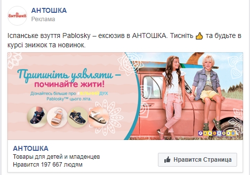 В Антошка продвигают страницу, используя для привлечения внимания эксклюзивный испанский бренд обуви Pablosky.