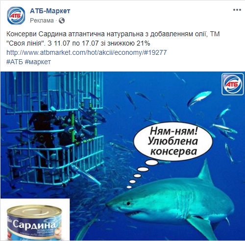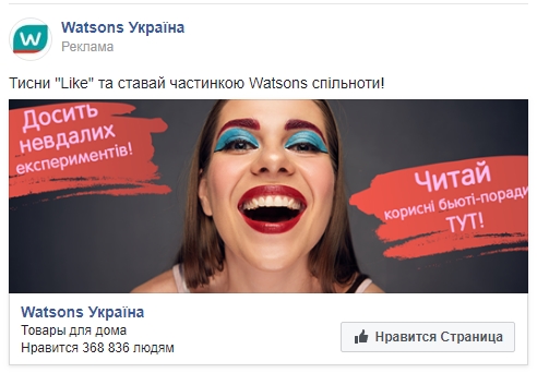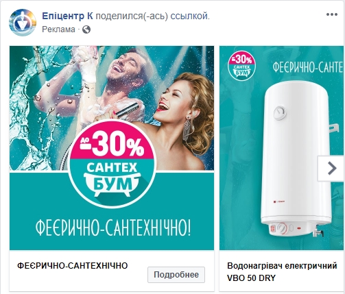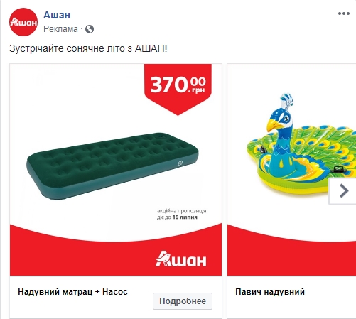 RAU изучила рекламные объявления более 50 страниц крупных украинских ритейлеров, а также некоторых ТРЦ. Большинство из них к разного уровня креативности картинке добавляют довольно простые фразы, вроде “у нас всегда выгодные предложения” или “жми “лайк” и будь всегда в курсе наших акций”. Таких объявлений у страницы может быть настроено до нескольких десятков. Есть и такие, кто в настоящий момент не использует официальную рекламу, например, ее не удалось найти у Leroy Merlin Україна, LC Waikiki, Книгарня Є, Велмарт, Нова Лінія, Prostor и многих других. Наиболее характерные и оригинальные примеры рекламных объявлений в Facebook RAU собрала в этом обзоре.