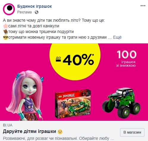 У сети магазинов детских товаров Будинок іграшок реклама настроена на двух языках, чтобы отдельно охватывать украиноязычную и русскоговорящую аудиторию. Причем основная часть объявлений отправляет Facebook-пользователей сразу на сайт. Впрочем на продвижение страницы три объявления также настроено. “Даруйте, Дивуйте, Дурiйте!”, – подписано в одном из них.