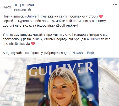 В столичном ТРЦ Gulliver, помимо страницы в Facebook, активно продвигают свой свой Instagram, а вместе с ним, собственный онлайн-журнал Gulliver Times. На обложке свежего номера – очаровательная Леся Никитюк, совсем недавно отметившаяся в рекламе Алло.