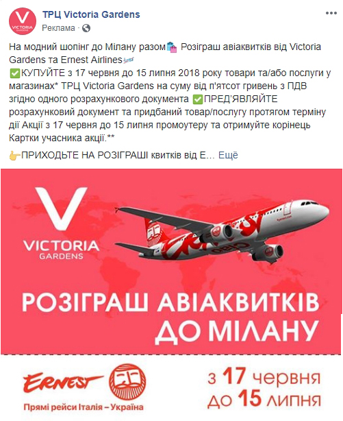 Во ТРЦ Victoria Gardens играют по крупному. Львовяне готовы своих подписчиков отправить в Милан на шопинг, от них требуется только оставить в ТРЦ сумму от 500 грн и не забыть посещать розыгрыши.