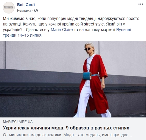 Маркет украинских handmade-производителей Всі.Свої находился в рейтинге крупнейших украинских ритейлеров в Facebook до апреля 2018 года. И только теперь можно убедительно ответить на вопрос, почему ритейлер его покинул – главный собиратель на одной локации всех made in Ukraine не концентрируется на развитии страницы Facebook. В рекламных объявлениях Всі.Свої можно найти только продвижение ближайших маркетов, а также, к примеру, статью об уличной моде. Мода прежде всего! И пускай Facebook подождет.
