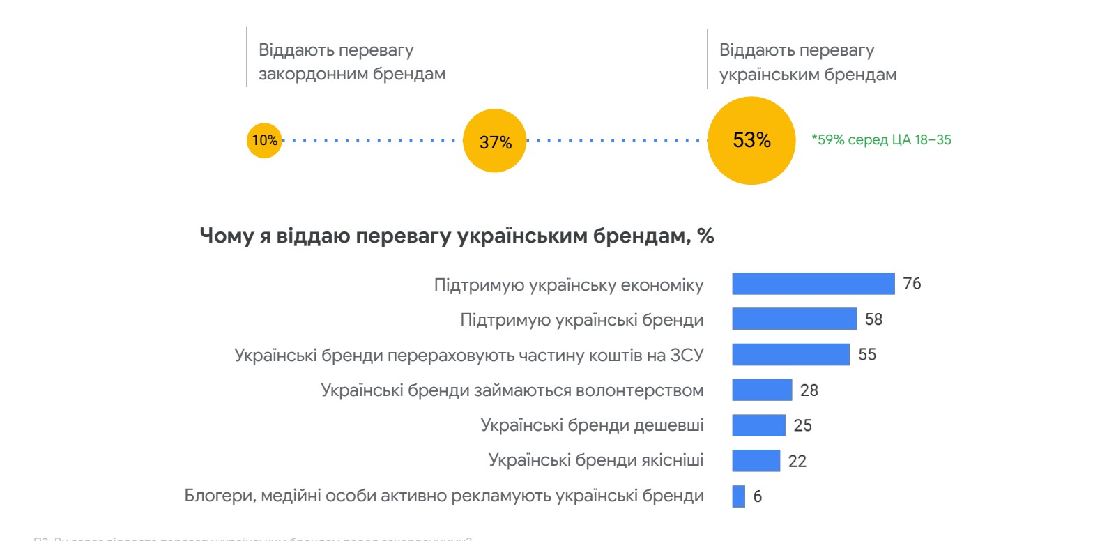 Отношение к брендам, продолжающим работать на территориях стран-агрессоров, крайне негативно: 71% бойкотируют такие компании и только 9% не обращают на это внимания и продолжают покупать. Украинцы ищут товары-заменители этим брендам (89%). В то же время 53% населения в возрасте 18-60 лет предпочитают украинские бренды, потому что стремятся поддержать как сами бренды так и украинскую экономику в целом. Среди молодежи этот показатель выше – почти 60%. Лишь 10% продолжают потреблять в большей степени импортные марки товаров.