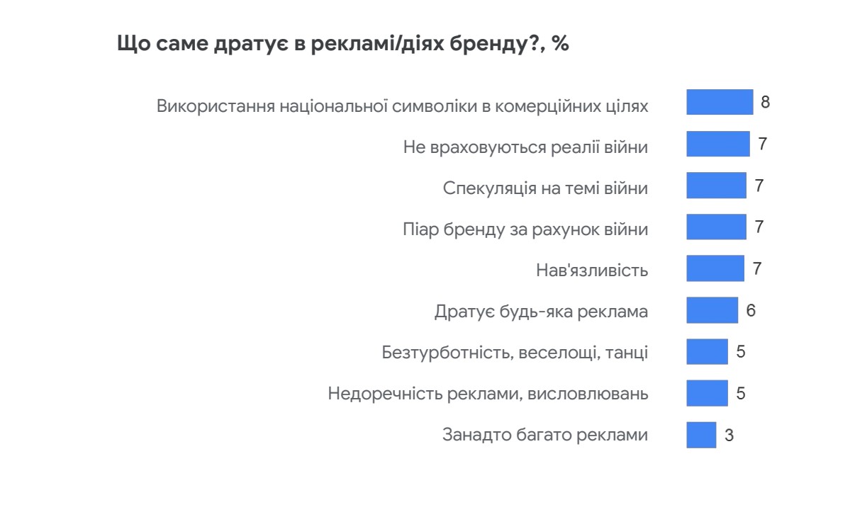 В то же время 23% украинцев отмечают, что в период военного положения есть действия брендов, которые раздражают: то, что они используют национальную символику в коммерческих целях, вообще не учитывают реалии войны, или же наоборот спекулируют и пиарятся на теме войны.