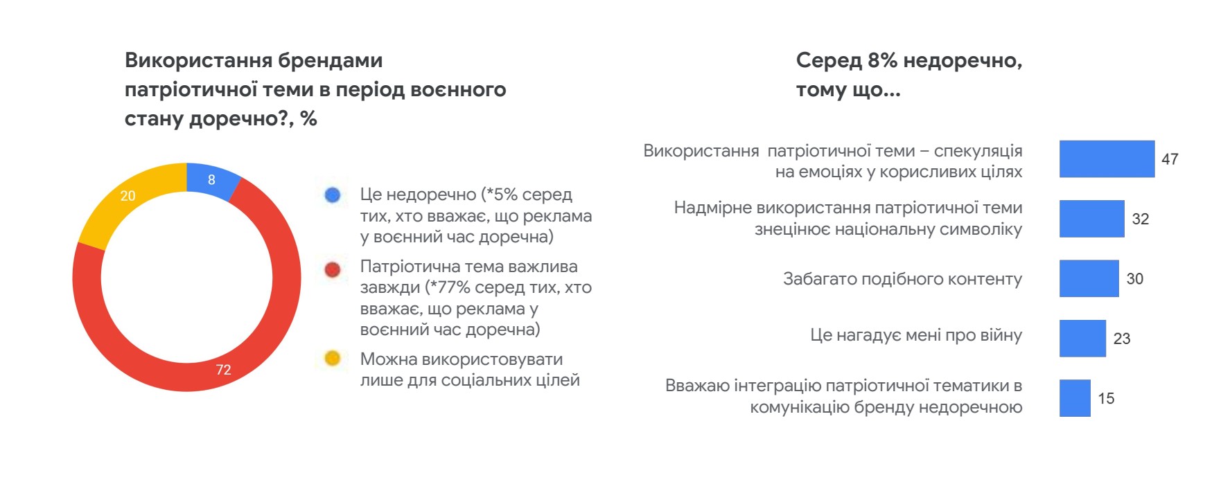 Поскольку многие не имеют любимых брендов, естественно, 54% опрошенных считают необходимым продолжение рекламирования товаров и услуг в военное время. Против этого выступает только 17%. Однако, как отмечают 45%, такие рекламные активности должны учитывать военные реалии, а 55% считают уместным использование военной темы. Патриотическая тема в рекламе очень уместна – так считают 92%.