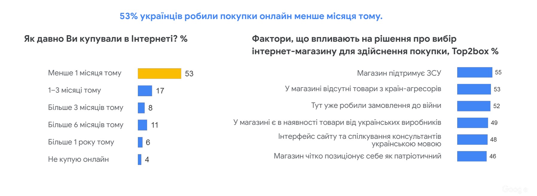 Исследование проводилось в августе 2022 методом онлайн-опроса 1200 респондентов в возрасте от 18 до 60 лет, проживающих во время войны в городах с численностью населения более 50 000 жителей. Следует также заметить, что три четверти опрошенных имеют высшее образование, более половины (53%) довольно часто покупают онлайн (что-то выбирали в интернете меньше месяца назад) и только 4% респондентов ничего не покупают онлайн. Его результаты представила в своей презентации отраслевой менеджер, креативные стратегии, Google Алина Бородий. RAU предлагает ознакомиться с его основными тезисами.