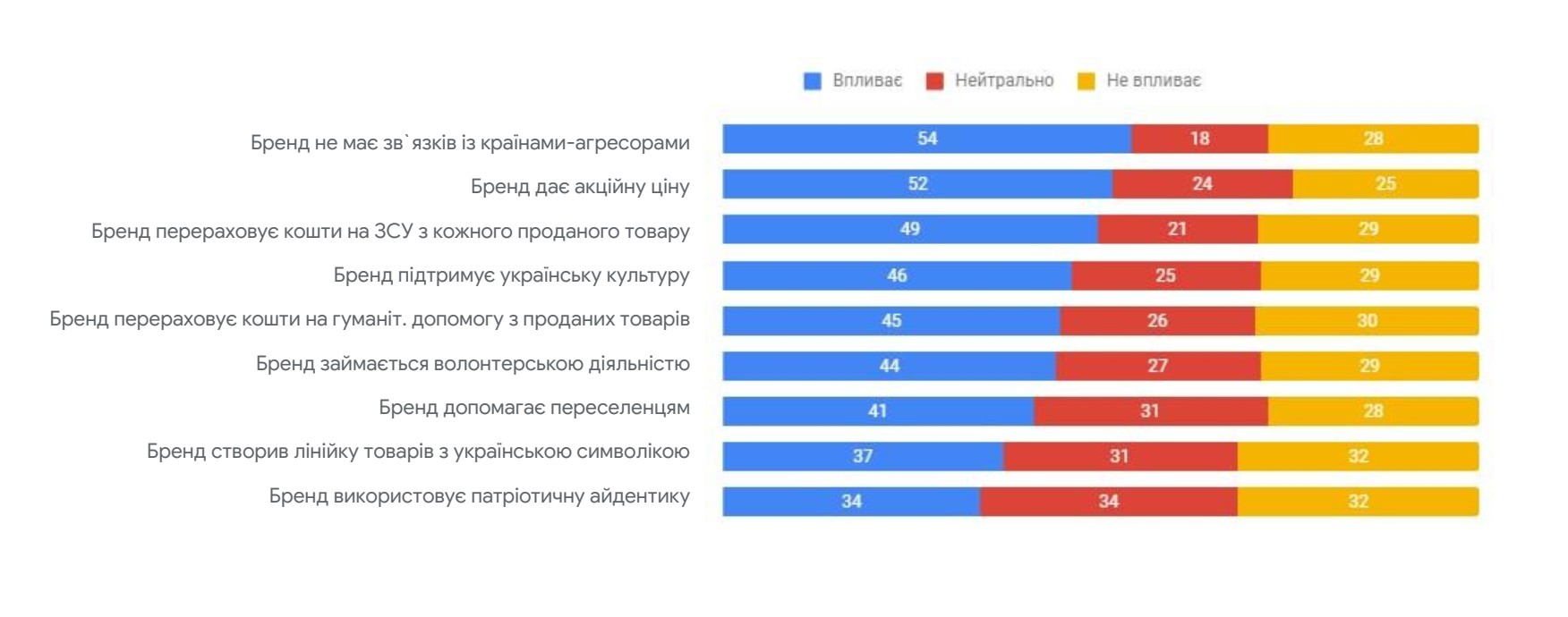При выборе бренда наибольшее значение имеет связь бренда со странами-агрессорами, цена и поддержка ВСУ. Только треть респондентов при выборе товара учитывает наличие линейки товаров с украинской символикой или использование патриотической айдентики. Потому что 51% опрошенных считает практические действия брендов (например, волонтерство) более ценными, чем символические действия, например, использование украинской айдентики.