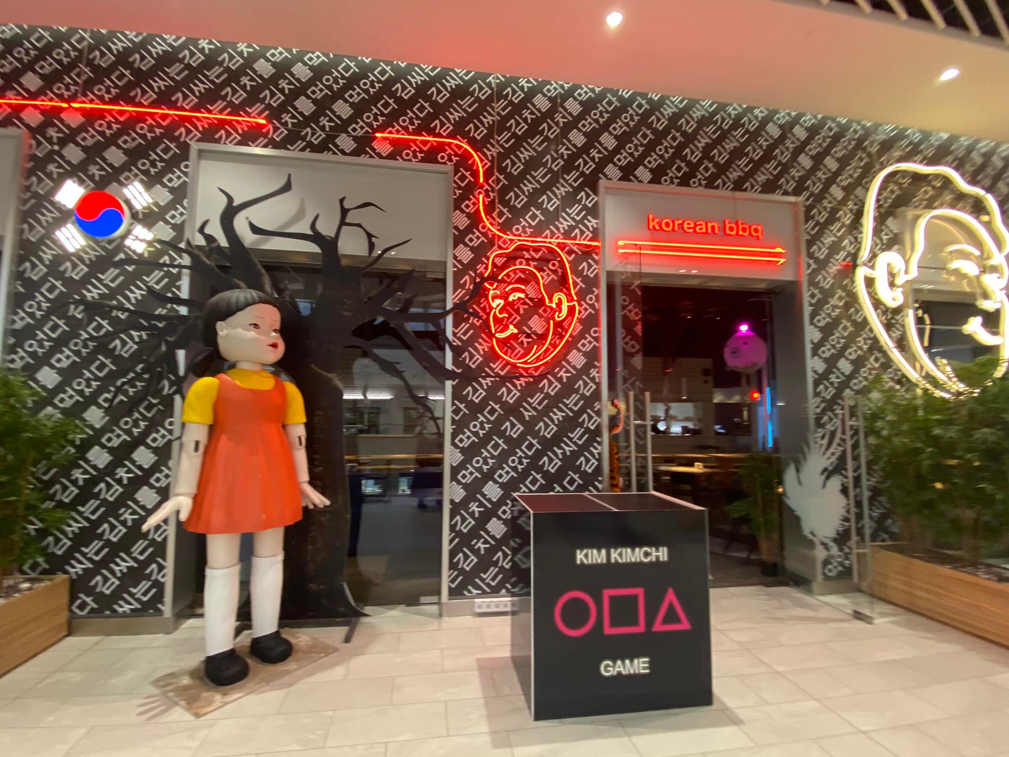 Kim Kimchi BBQ – первое в Украине корейское барбекю с авторской кухней от международного бренд-шефа из Кореи. Главная фишка заведения — барбекю-столы со встроенными решетками для гриля и использованные в оформлении элементы из сериала «Игра в кальмара».