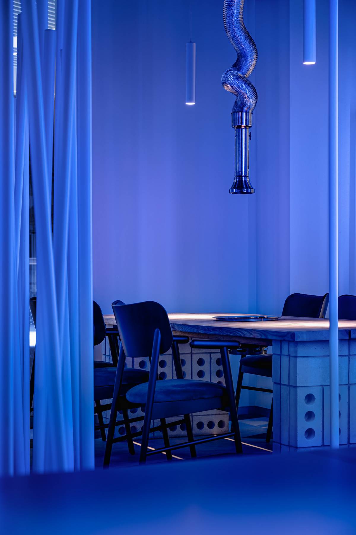 Площадь заведения, рассчитанного на 130 посадочных мест, составляет более 400 кв. м. На входе в ресторан гостей встречают визуальные элементы из шоу, в том числе двухметровая кукла-убийца из сериала. По сюжету одного из эпизодов шоу, игроки соревнуясь за большой денежный приз, должны добежать до финиша, пока такая кукла поет. Когда она замолкает, всех, кто не успел замереть, она «убирает».