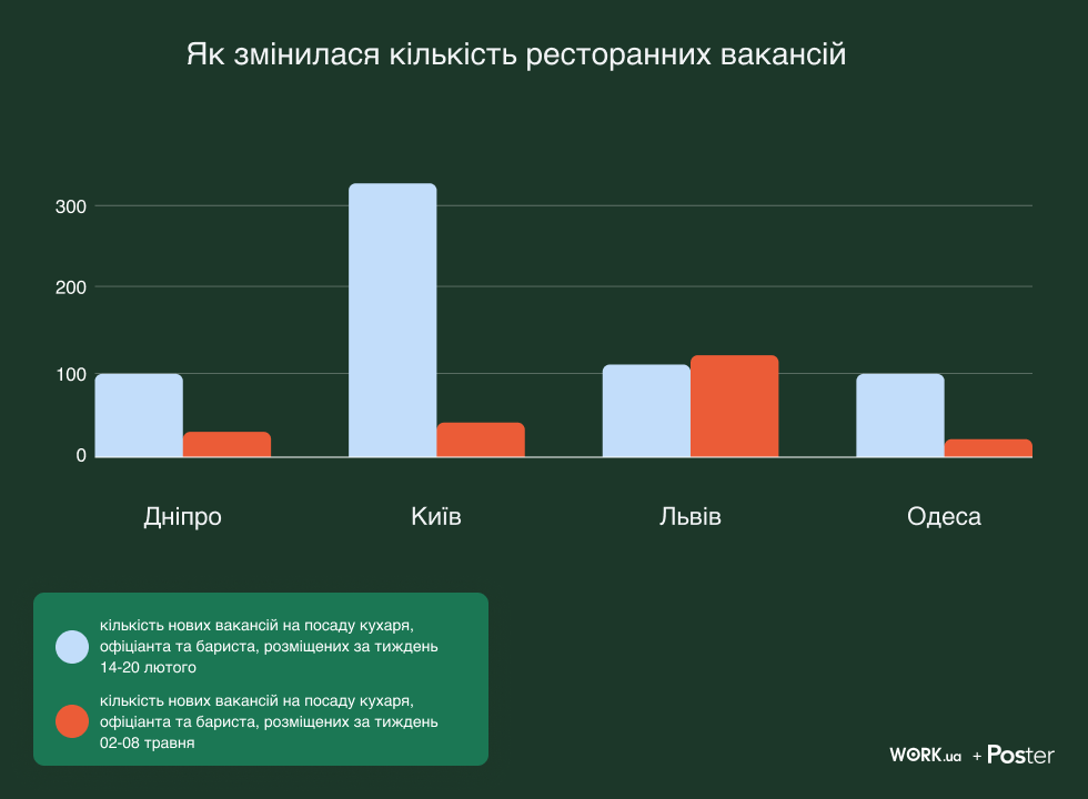 За неделю до войны 14-20 февраля в четырех крупных городах Украины – Киеве, Одессе, Львове и Днепре на сайте Work.ua было размещено 655 новых вакансий по наиболее популярным ресторанным специальностям – повар, бармен, официант. В начале мая количество таких вакансий упало более чем втрое — до 203.