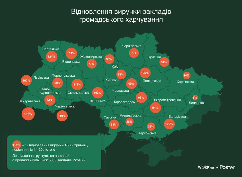 Худшие показатели в регионах на востоке и юге страны – там заведения пытаются продолжать работать, но в Донецкой области получают только 6% довоенной выручки, в Харьковской – 14%, в Херсонской – 21%, в Николаевской – 25%. Данных о Луганской области нет из-за отсутствия активных клиентов Poster в этом регионе.