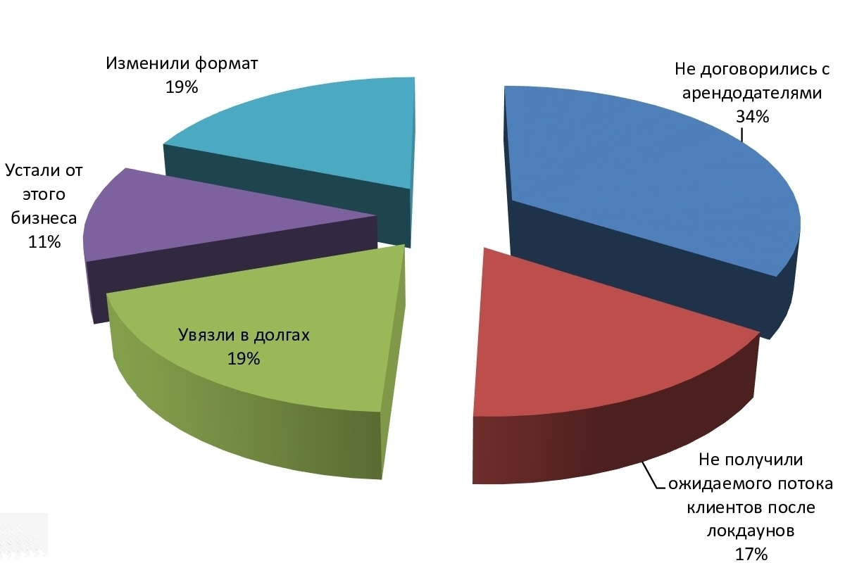 Как показывают данные компании «Ресторанный консалтинг», 34% ресторанов закрылись, поскольку их владельцы не смогли договориться с арендодателями, фактически дотируя владельцев помещений. Другие увязли в долгах, так как надеялись, что через короткое время карантин закончится и все вернется на круги своя. Таких оказалось 19%. Замыкает тройку самых больших сложностей – сокращение ожидаемого потока клиентов после локдаунов (17%).