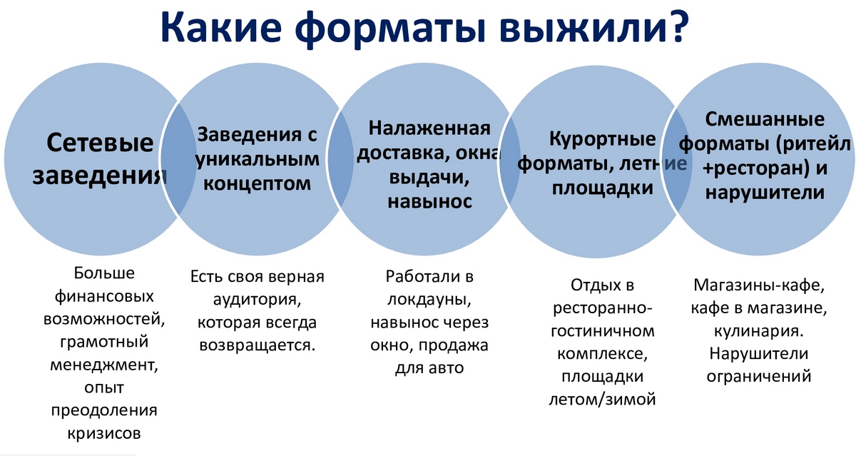 Конечно, не все из этих форматов успешно выживали. Дело ведь не только в формате заведения, а в сочетании массы других факторов. Например, удалось ли договориться с арендодателем о снижении платы за помещение. Насколько уникален сам концепт заведения. Как удалось решить вопрос с доставкой, снизить во время локдауна затраты на содержание бизнеса и прочее.