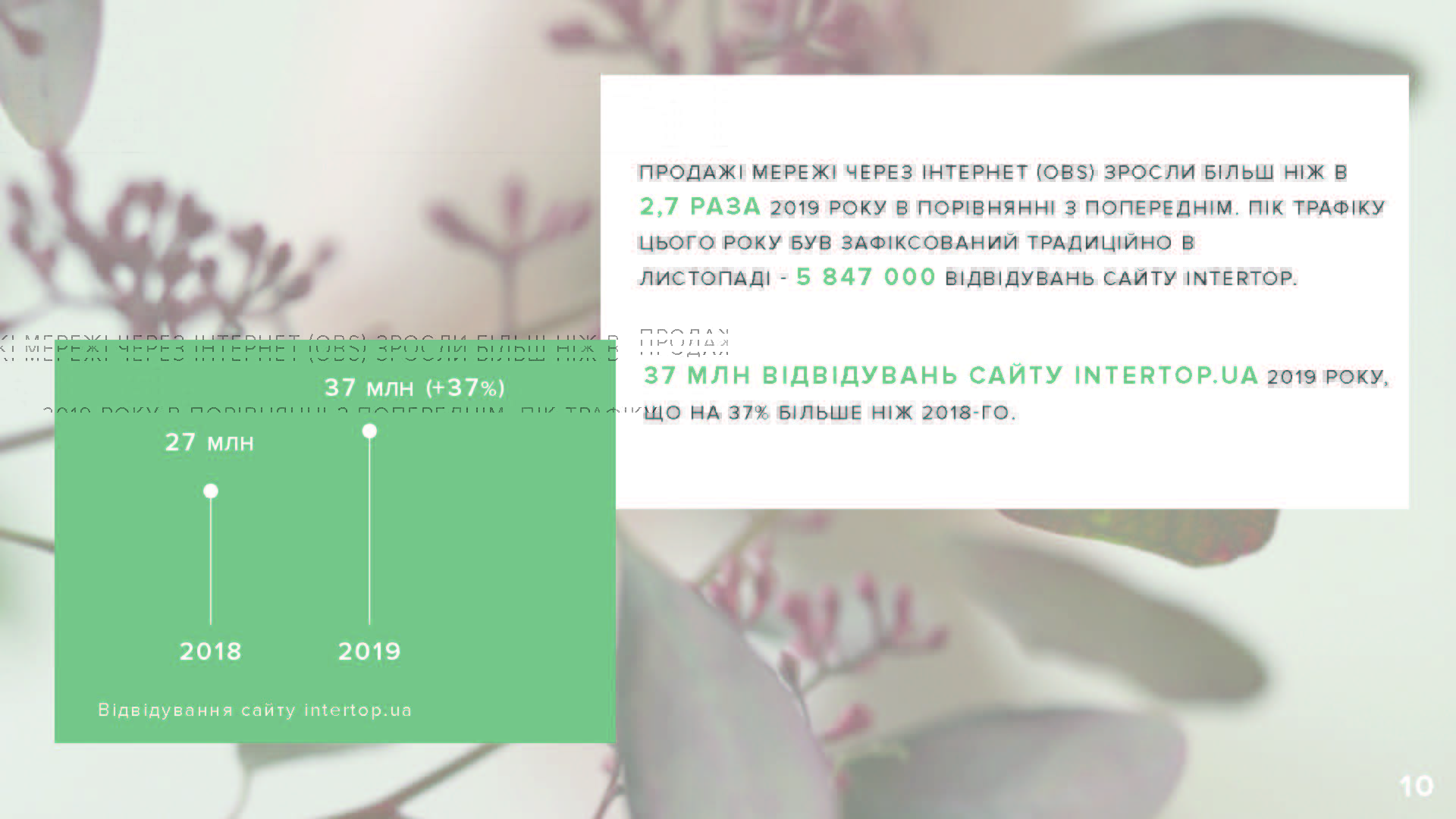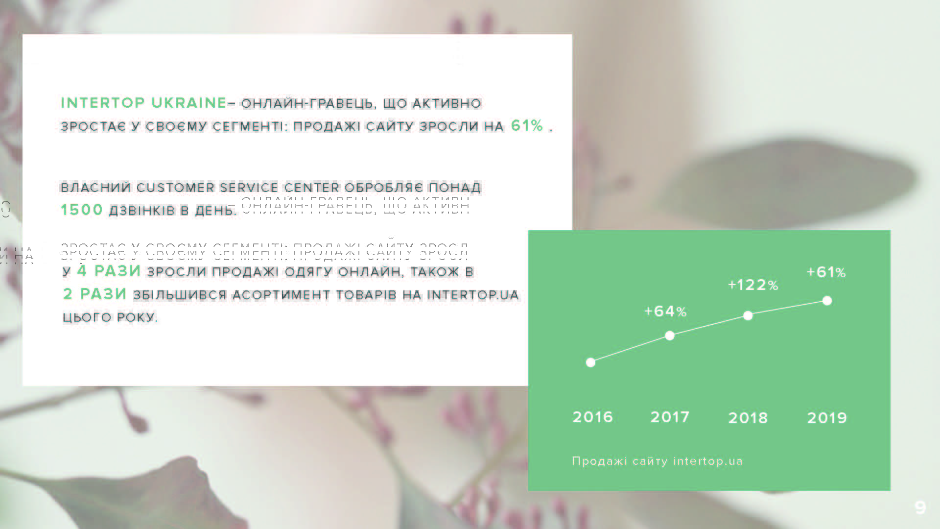Также Intertop активно развивает онлайн-торговлю. За прошлый год общие продажи ритейлера через Всемирную паутину выросли на 61%, а продажи категории «одежда» увеличились в четыре раза. Также в два раза расширен ассортимент интернет-магазина. Всего в 2019-м на сайте Intertop зафиксировано свыше 37 млн посещений – на 37% больше, чем годом ранее. За год ритейлер обработал несколько менее 5,5 млн онлайн-заказов: в среднем почти 15 000 в день. «Из классической обувной компании мы трансформируемся в технологический fashion-ритейл», – подчеркнул генеральный директор Intertop Ukraine Сергей Бадритдинов.