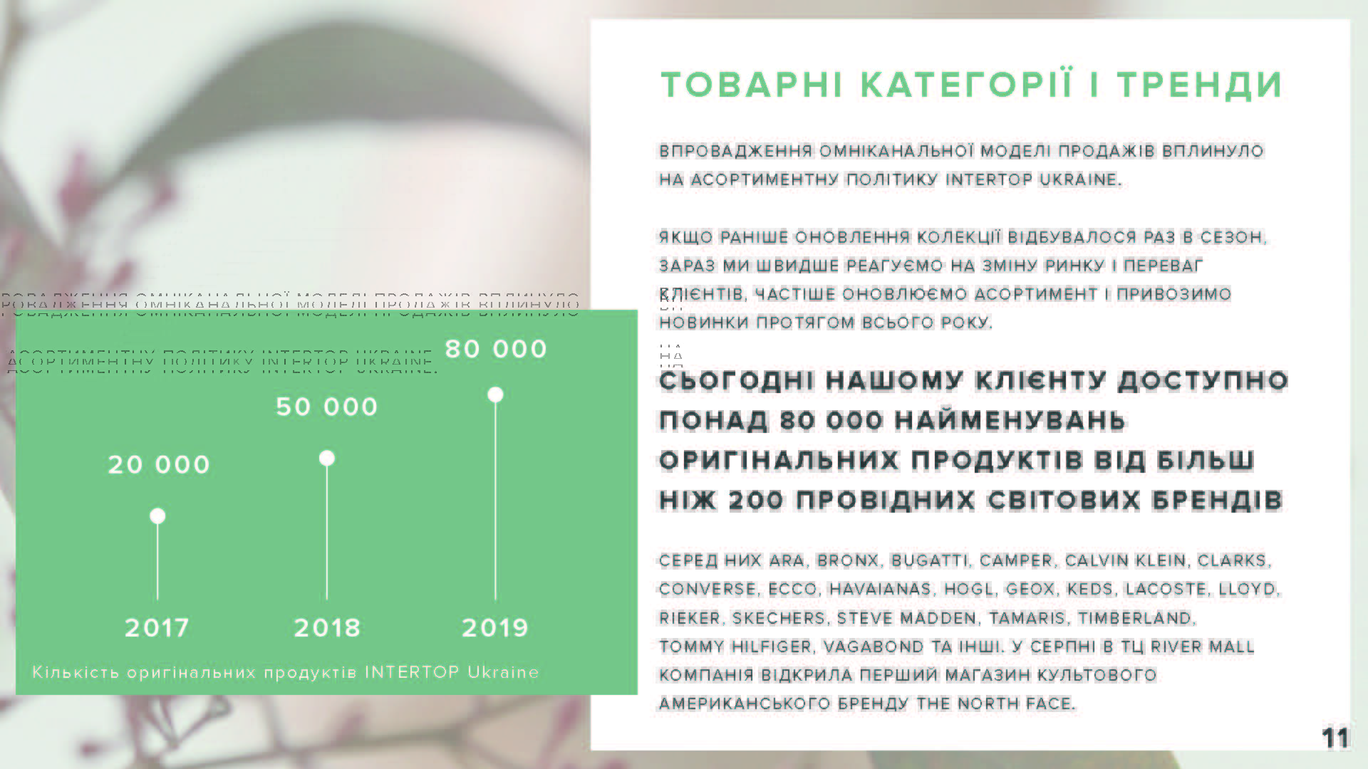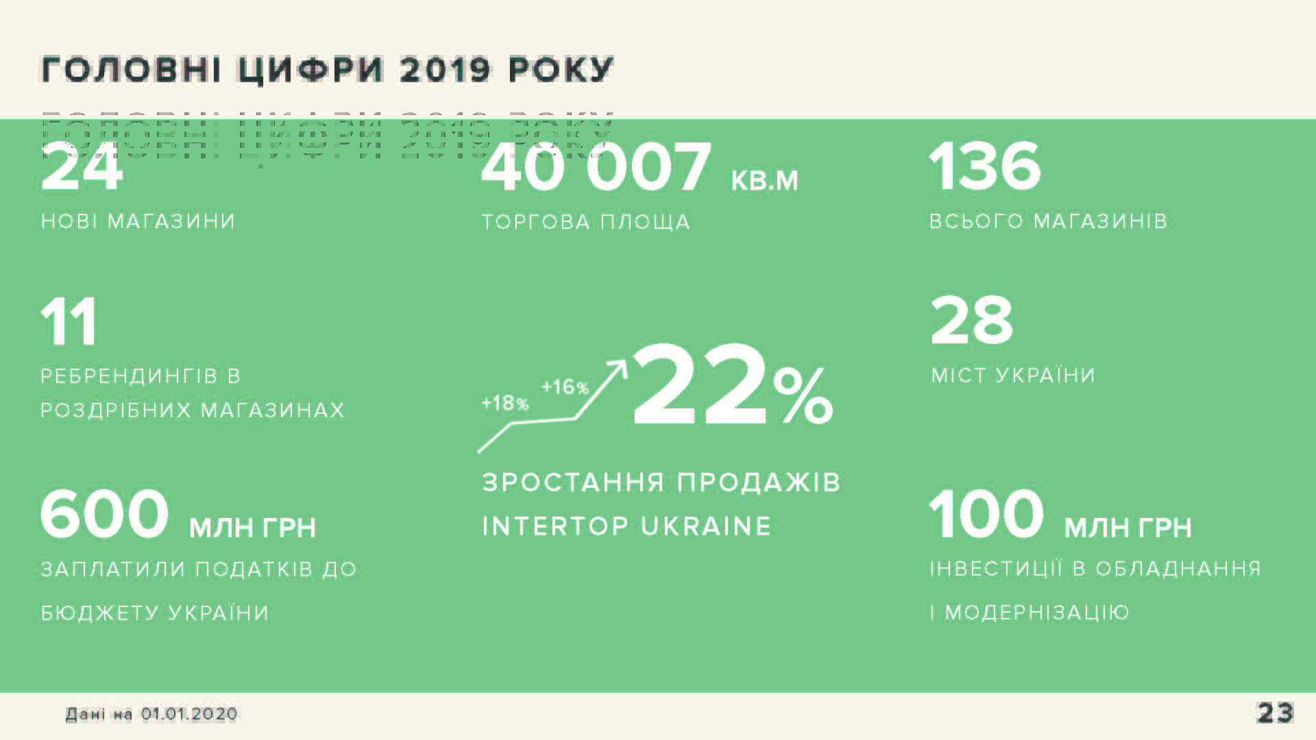 Как сообщили на встрече с журналистами топ-менеджеры Intertop, прошлый год выдался очень удачным для группы компаний, которая представлена в Украине 14-ю розничными сетями, работающими под разными брендами. Всего в портфель компании по состоянию на начало 2020 года входит больше 200 торговых марок, в том числе – 45 украинских.