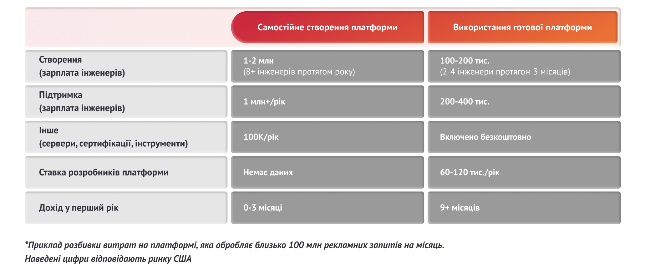 На первый взгляд более логичным может показаться создание собственной рекламной технологии, которую ритейлер сможет персонализировать и настроить под себя для эффективного сотрудничества с брендами. Но создание такого решения, кроме того, что займет от нескольких месяцев до нескольких лет, так и обойдется очень дорого.