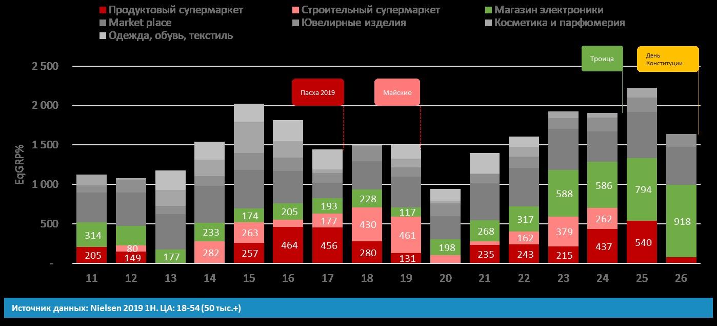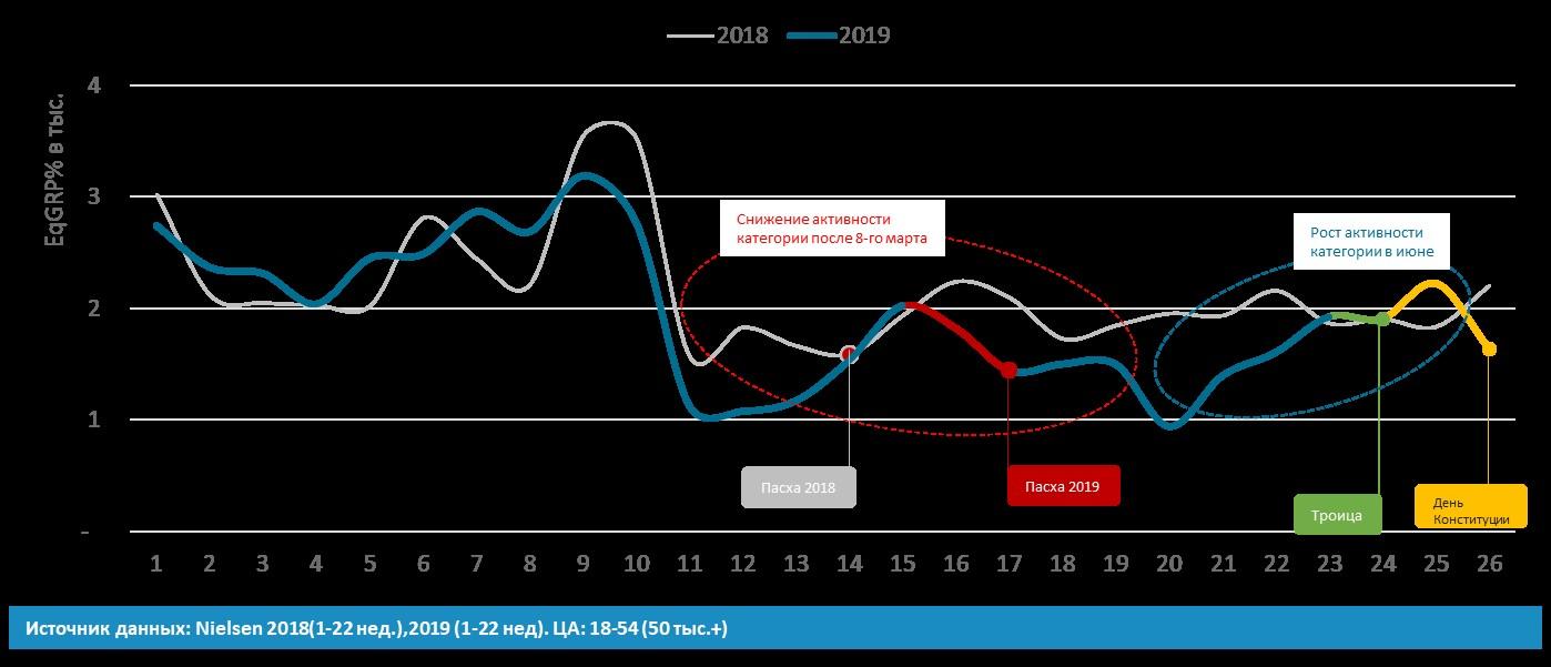 В целом активность ритейлеров на ТВ продолжает быть ниже прошлого года. Практически каждая неделя 2019-го проигрывала аналогичной неделе предыдущего года. Исключение составляют несколько предпраздничных недель, что говорит о том, что ритейлеры в 2019 году намного больше сконцентрировались на периоды повышенной покупательской активности. Во втором квартале такими периодами были Пасха и майские праздники, Троица и День Конституции.