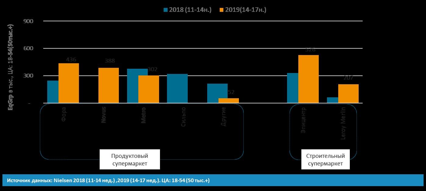 Среди тех, кто был активен в апреле, стоит выделить двукратное по сравнению с прошлым годом усиление Форы, появление в эфире Novus. Но не присутствовали на ТВ традиционно сильные кампании Сільпо. В категории строительного ритейла кампании Эпицентра и Leroy Merlin были значительно более активными, чем в предыдущие годы.