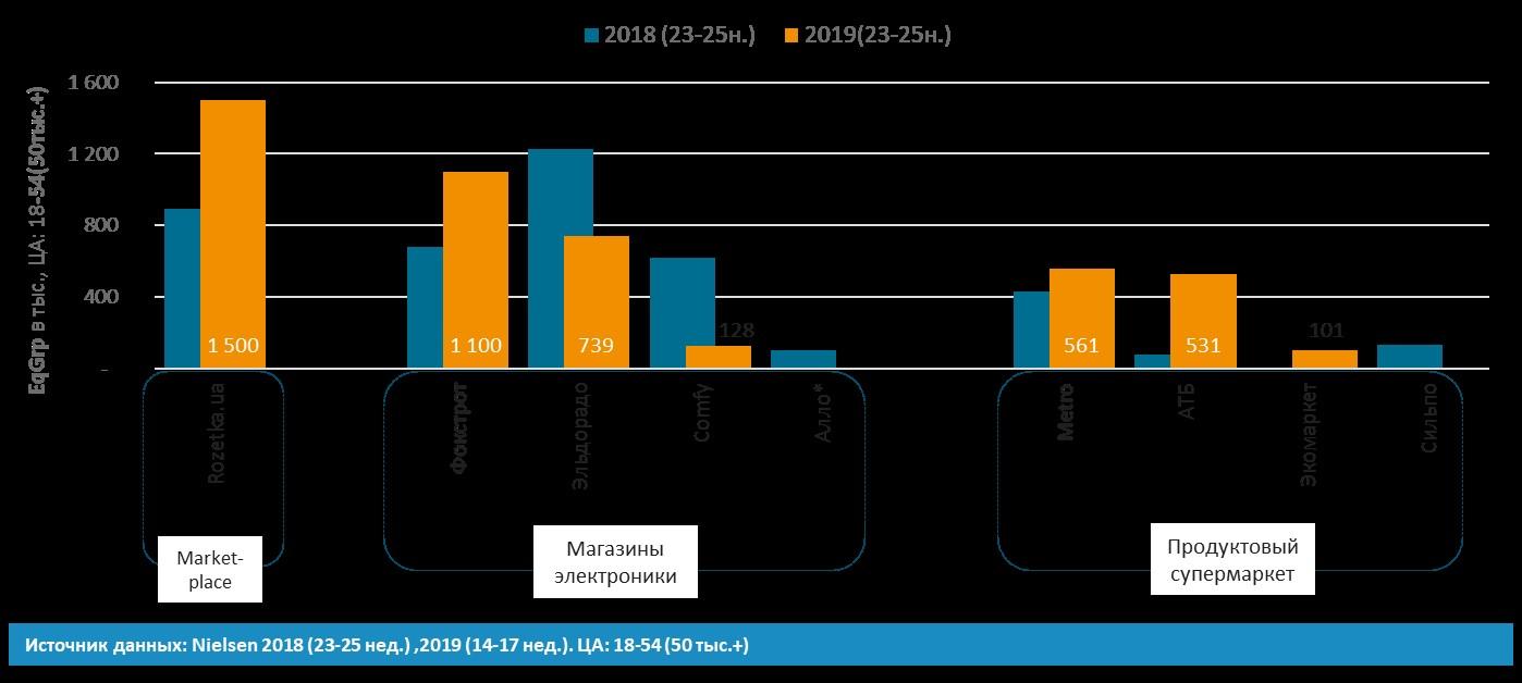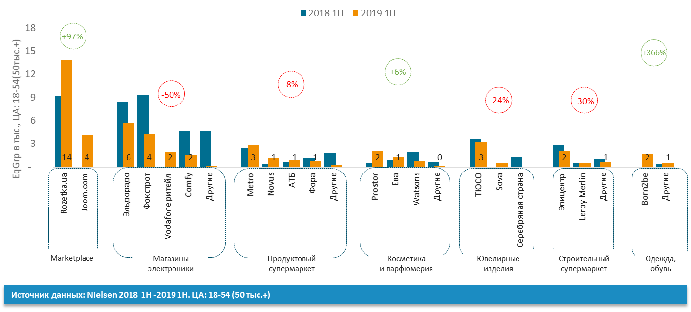 Общее снижение рекламной активности может быть связано с «проседанием» привычной динамики роста розничного товарооборота. Так по данным Министерства финансов в первые месяцы 2019 года был +12-14% к аналогичному периоду прошлого года, хотя ранее прирост был +25%. Объяснениями могут быть и политическая нестабильность, выборы, и льготная растаможка авто на еврономерах, на которую население потратило 13 млрд грн, которых не хватило в товарообороте для продолжения динамики в +25%. В любом случае, после всех этих событий в мае розничный товарооборот значительно вырос (+30% по сравнению с маем 2018), что обещает возобновление активной борьбы ритейлеров за своих покупателей.