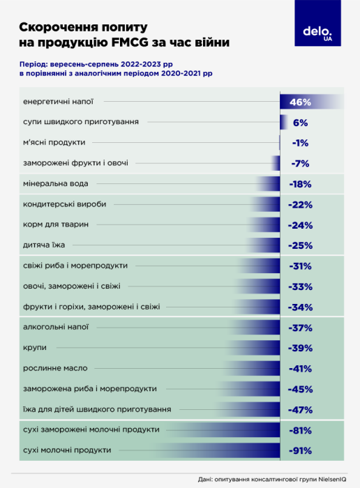 С началом большой войны, многие украинцы выехали за границу, что сказалось на украинском рынке FMCG. Как сообщает Михаил Гафуров, руководитель отдела по работе с клиентами компании NielsenIQ, осенью 2023 года в стране проживало около 25 млн человек, что на 15% меньше, чем до большой войны. Но потребление продуктов украинцами «провалилось» не на 15%, а гораздо больше. К примеру, спрос на крупы снизился на 39%, в категории замороженной рыбы и морепродуктов – до 45%, а в сухих молочных продуктах – до 91%.