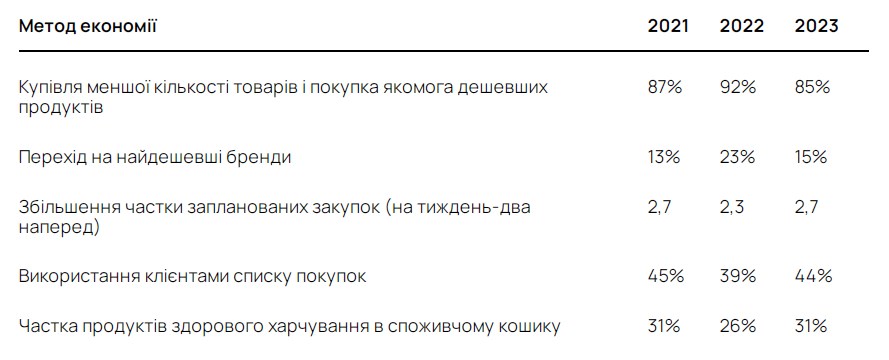 Как показывает исследование NielsenIQ, более 90% украинцев начали экономить на продуктах повседневного потребления в той или иной степени. К примеру, в 2023 году 15% перешли на самые дешевые бренды, в довоенное время эта цифра была 13%. Также потребители чаще стали использовать списки продуктов. Далее приведен сравнительный анализ по годам: