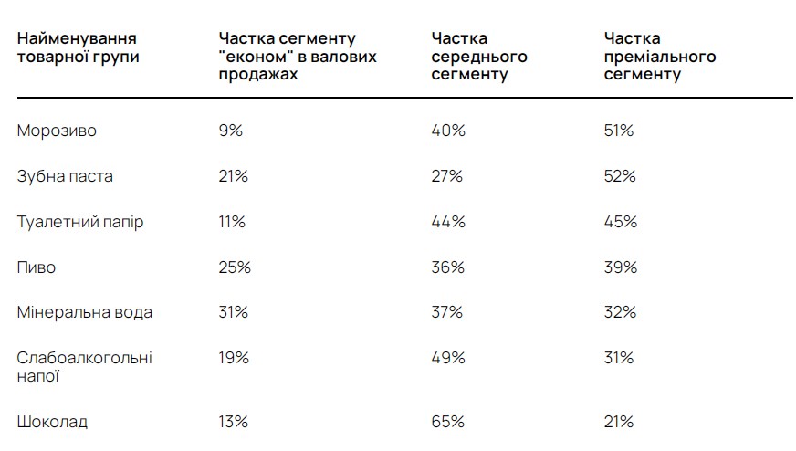 В 2023 году 44% используют списки продуктов, но при этом, как отмечает Данил Майстренко, значительным спросом продолжают пользоваться товары средней и премиальной ценовой категории. То есть даже в условиях войны потребители не собираются отказываться от любимых продуктов и брендов. Это хорошо видно из приведенной сравнительной таблицы: