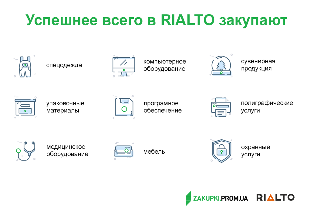 Система электронных торгов RIALTO функционирует второй год. За это время здесь начали проводить закупки такие гиганты рынка, как Фармак, МАУ, Брокард, Нова пошта, Roshen, Watsons, Воля-кабель и много других.