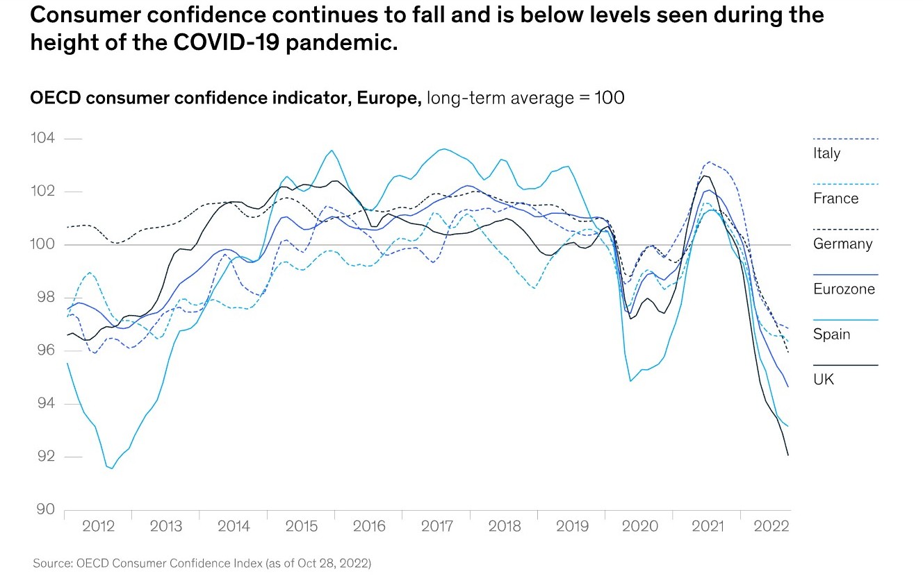 В то же время потребительские настроения начали падать, а расходы – сокращаться. Цепочки поставок постепенно становились более надежными, но внезапное увеличение количества доступных вещей в сочетании с сокращением потребительских расходов привело к повсеместному затовариванию. Начиная со второй половины 2022 года, экономические перспективы ухудшались на фоне роста беспокойства по поводу геополитической нестабильности и динамики процентных ставок, которые усилили ограничения как для компаний, так и для семейных бюджетов.
