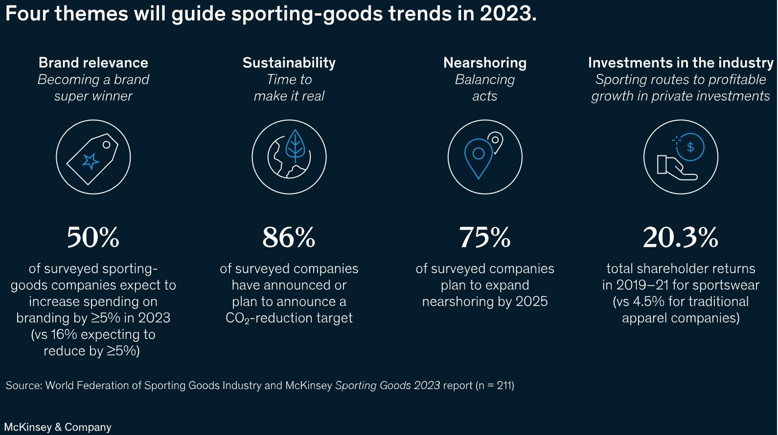 Всемирная федерация индустрии спортивных товаров (WFSGI) и международная консалтинговая компания McKinsey & Company представили третий ежегодный отчет по индустрии спортивных товаров Sporting goods 2023: The need for resilience in the world in disarray. В частности, исследователи отметили спад продаж спортинвентаря, одежды и обуви после повышенного спроса на эти товары во время пандемии. Потребителями теперь движет желание сэкономить в условиях растущей экономической неопределенности и риска более масштабной рецессии. Как показала практика, простое повышение цен не перекрывает падение объемов продаж, поэтому компании вынуждены искать новый баланс между сбережениями и инвестициями. Чтобы помочь компаниям лучше пережить период крайней неопределенности и подготовиться к следующей волне роста, эксперты выделили несколько ключевых тенденций, которые повлияли на отрасль в прошлом году и будут определять ее результаты в 2023 году.