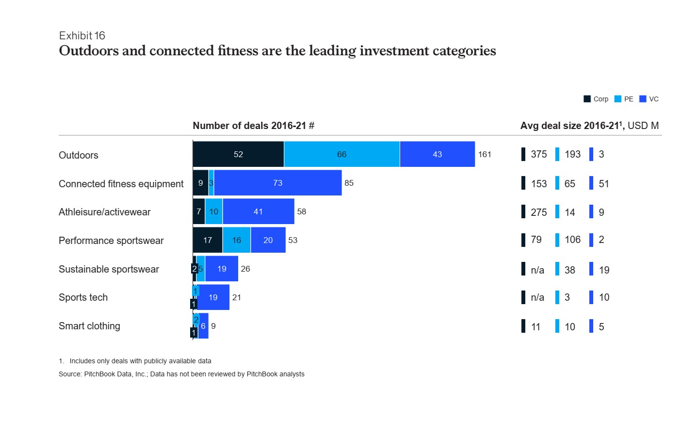 Эти факторы вызвали интерес у частных инвесторов, включая фирмы венчурного капитала, фонды прямых инвестиций и другие компании. Основной интерес вызывают категории товаров для активного отдыха, подключенное оборудование для фитнеса, спортивная одежда и одежда для активного отдыха, а также экологичная спортивная одежда.