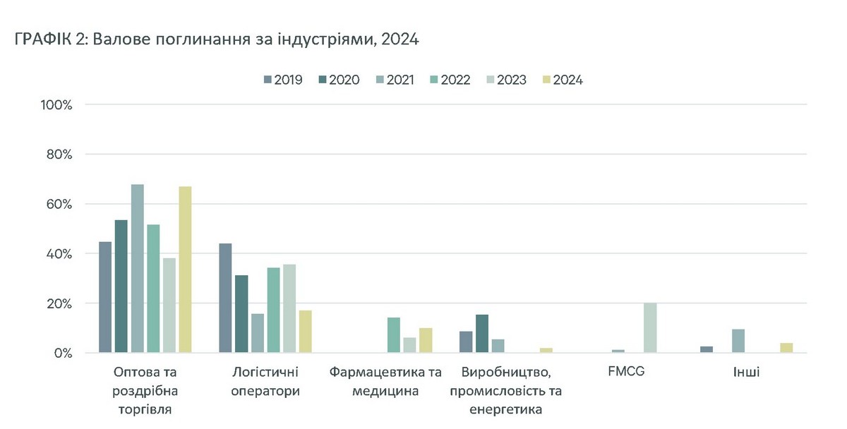 По состоянию на конец 2024-го сектор оптовой и розничной торговли доминировал в структуре валового поглощения с долей 67%, на втором месте 3PL-операторы с долей 17%. Интересно, что доля торговых компаний выросла на 33% год от года, а логистические операторы, напротив, сократили ее на 19%.