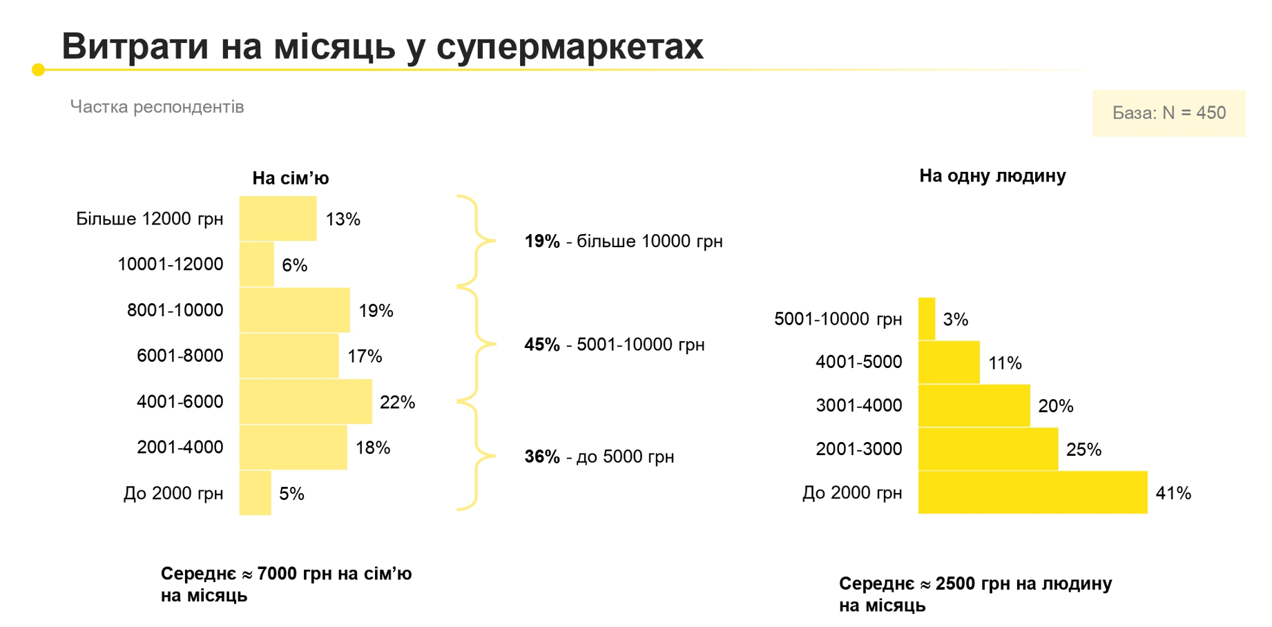 Исследование проведено осенью 2021 среди 450-ти респондентов, методом личного интервью face-to-face и фокус-групповое исследование трех возрастных категорий. Свои денежные расходы жители типичного города-спутника распределяют следующим образом. Средний показатель расходов в супермаркетах в месяц составляет: на семью – 7000 грн, на одного человека – 2500 грн. Молодежь посещает магазин каждый день, а пожилые люди несколько раз в неделю. В процентном отношении частота покупки среди всех респондентов имеет следующее распределение: 59% – покупают ежедневно, 38% – несколько раз в неделю, 3% – раз в неделю или реже.