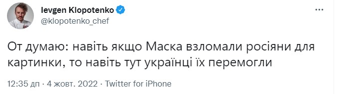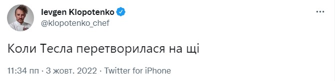 Шеф-повар Евгений Клопотенко не может понять, когда это “Тесла превратилась в щи”. В другом твите кулинарный эксперт пришел к выводу, что “даже если Маска взломали россияне, то даже здесь украинцы победили их”.