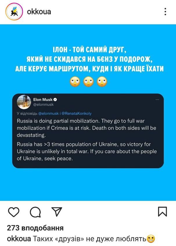После месяцев непоколебимой поддержки украинцев в войне за их самоопределение и выживание как нации, 3 октября генеральный директор компаний Tesla и Space X Илон Маск внезапно написал политически некомпетентную ерунду в Twitter о “формуле” окончания войны между Украина и россия. Он предложил провести еще один референдум и отдать Крым. Реакция соцсетей и многих официальных персон была мгновенной и однозначной. “Fuck off is my very diplomatic reply to you”, – написал из своей верифицированной учетной записи в Twitter бывший посол Украины в Германии Андрей Мельник. Было много и других слов не поддержки. Высказались и ритейлеры и компании из смежных отраслей бизнеса – RAU собрала самые яркие из их ответов американскому миллиардеру.