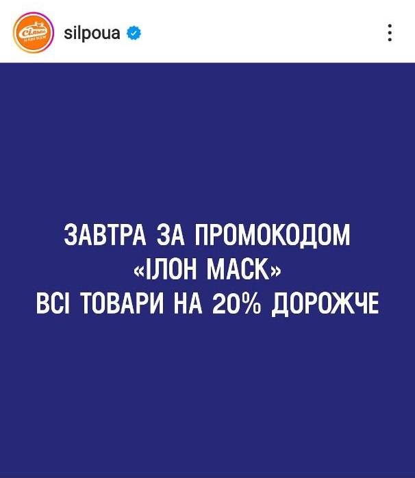 Сеть супермаркетов Сільпо была одной из самых первых компаний, кто отреагировал на странный опрос Маска. В честь него ритейлер ввел промокод “Илон Маск”, согласно которому все товары в магазинах можно приобрести на 20% дороже. Если предложение хорошее, то надо брать.