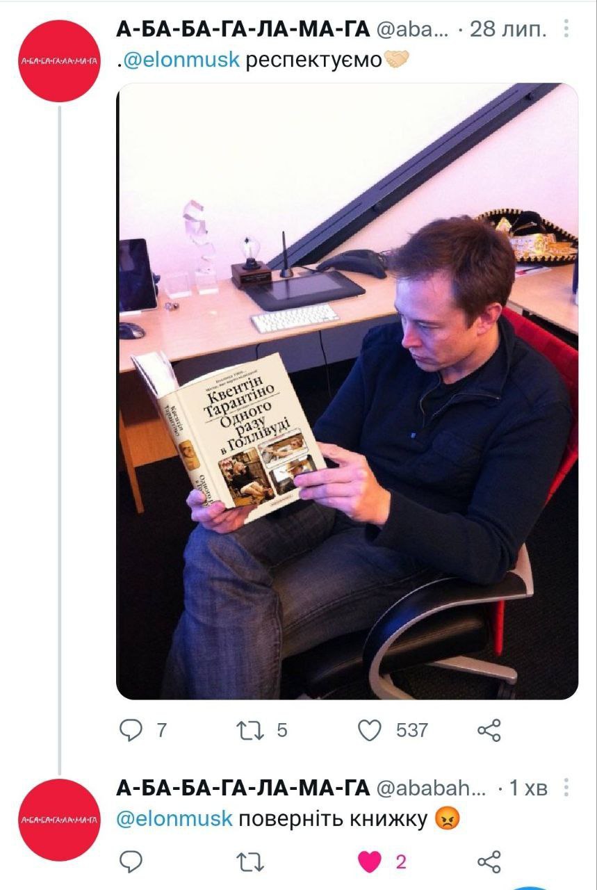 Издательство Абабагаламага припомнила собственный твит, где респектировала владельцу Tesla за то, что он читает на украинском. В комментарии к собственному твиту теперь издательство требует Илона вернуть книгу.