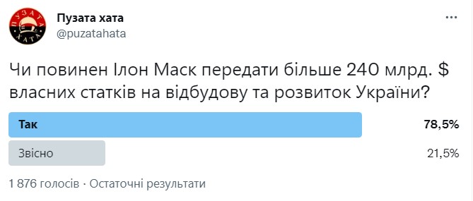 Сеть ресторанов Пузата Хата устроила в Твиттере собственный опрос, с предложением, чтобы Илон Маск передал более $240 млрд собственного состояния на восстановление и развитие Украины. 75% респондентов поддержали предложение.