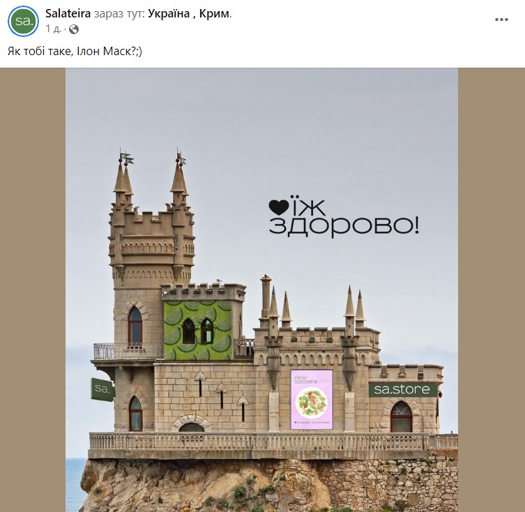 Сеть ресторанов Salateira далеко не ходила и объединила недавний мем о Ласточкином гнезде, появившийся после первого “хлопка” в Крыму, с классической фразой: “Как тебе такое, Илон Маск?”
