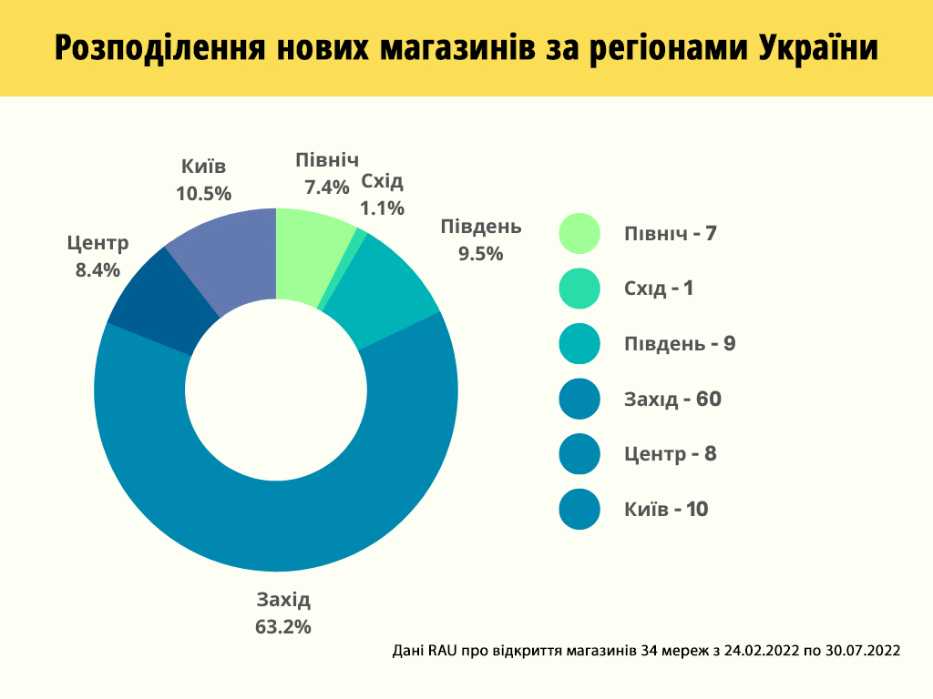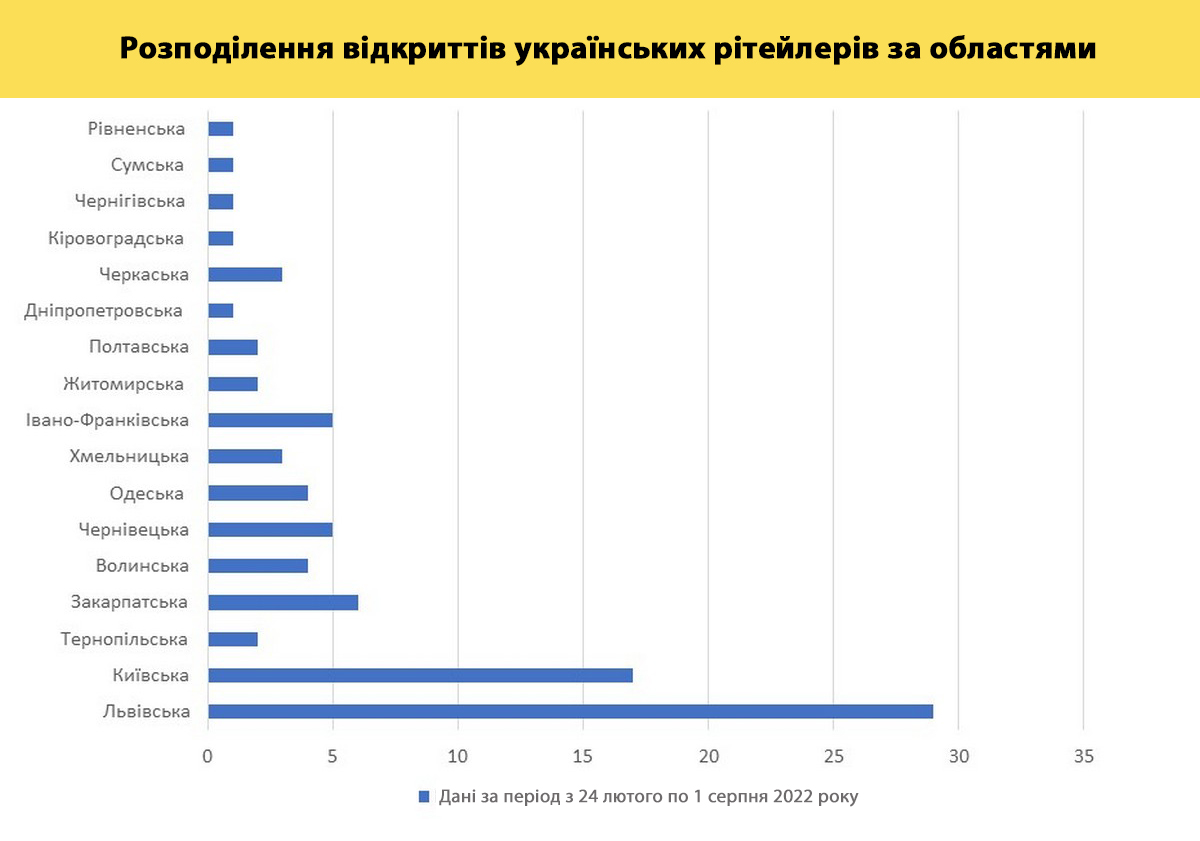 Направились на запад и многие другие компании. Первый новый Комп’ютерний Всесвіт появился в поселке Дубово на Закарпатье, а у Фокстрот – уже девятый и первый с начала войны во Львове. В сети салонов-магазинов Люксоптика открылось по магазину во Львове, Трускавце, Червонограде и Новограде-Волынском. Нашлось место для развития на западе Украины и ювелирному сегменту. Свой первый и пока единственный новый магазин с момента полномасштабного вторжения россии в Украину в ровенском ТРЦ Злата Плаза открыла SOVA. Сеть магазинов базовой одежды Famo открыла в апреле новую точку продаж в Ужгороде, а итальянский косметический бренд Kiko Milano – во львовском ТРЦ Forum Lviv. VOVK открыли новый магазин в Мукачево, Marathon – в Черновцах и этот список можно продолжать. Очевидно, поток новых операторов в западном регионе только начался, но уже набирает обороты.