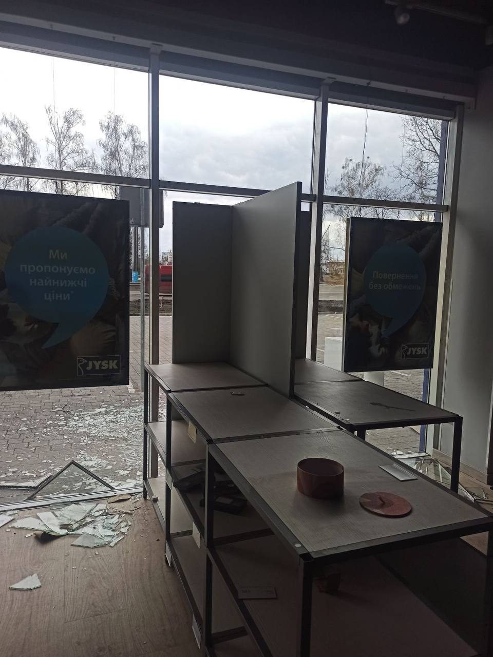 Еще один магазин сети, работавший в Retail Park Bucha, во время оккупации был полностью разграблен: товар вынесен, а техника и оборудование повреждены. В частности, были повреждены стеклянные фасады, выломанные двери в магазин и т.д. Общие потери магазина в Буче составили почти 8 млн грн. Несмотря на текущие сложности с логистикой и снабжением, магазин уже восстановлен на 100% и соответствует новому формату сети 3.0. Магазин Jysk в ТРЦ Retroville в Киеве был частично поврежден после ракетного удара 20 марта, но возобновил работу уже в июне.