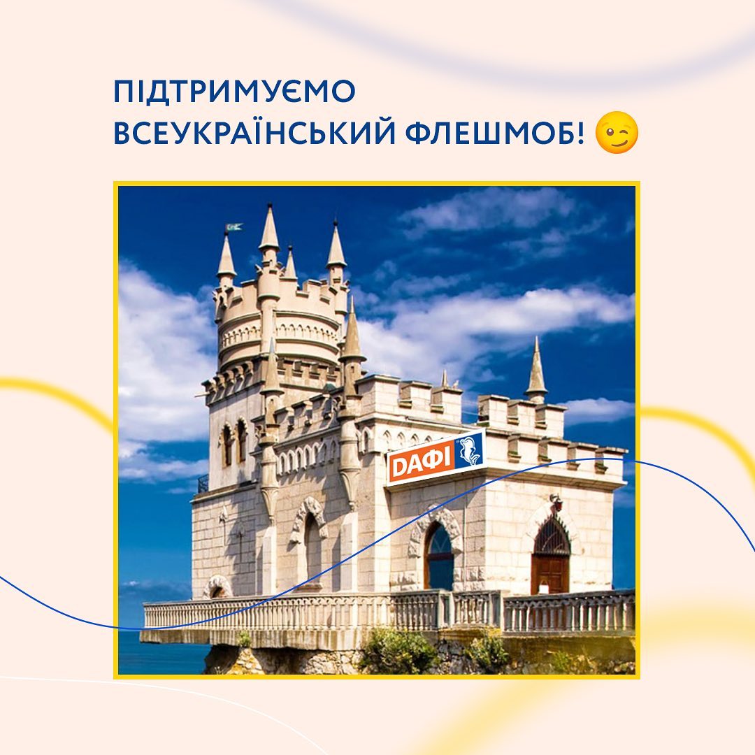 Поддержал всеукраинский флешмоб харьковский ТРЦ Дафи. Правда спрятал все логотипы внутрь торгово-развлекательного центра. Наверное, чтобы фасад не портить.