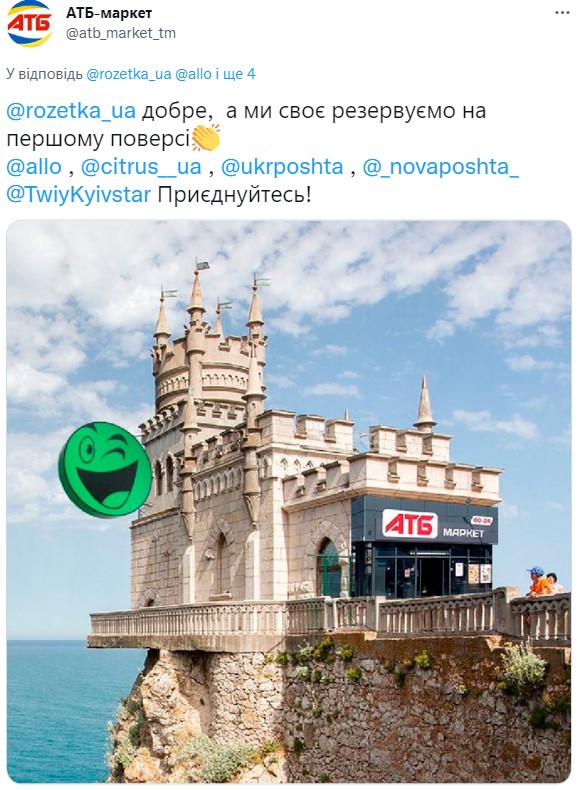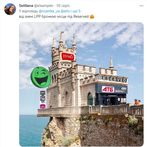 После того, как 9 августа на российской авиабазе в Новофедоровке произошел “хлопок”, украинские ритейлеры устроили шутливый тред на тему, кто после деоккупации Крыма займет какой ярус на знаменитом памятнике архитектуры – Ласточкином гнезде. Тред превратился в большой флешмоб, к которому присоединились компании разных сегментов. Кто и как видит свое возвращение в Крым и где (в шутку, конечно же) хотел бы открыться, – в подборке RAU.