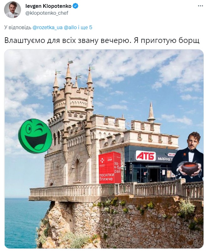 Первым забронировал себе место на Ласточкином Гнезде маркетплейс Rozetka. «Чур наше место», — написал ecommerce-гигант в Twitter и отметил ряд других компаний, чтобы те присоединились к запущеному треду.