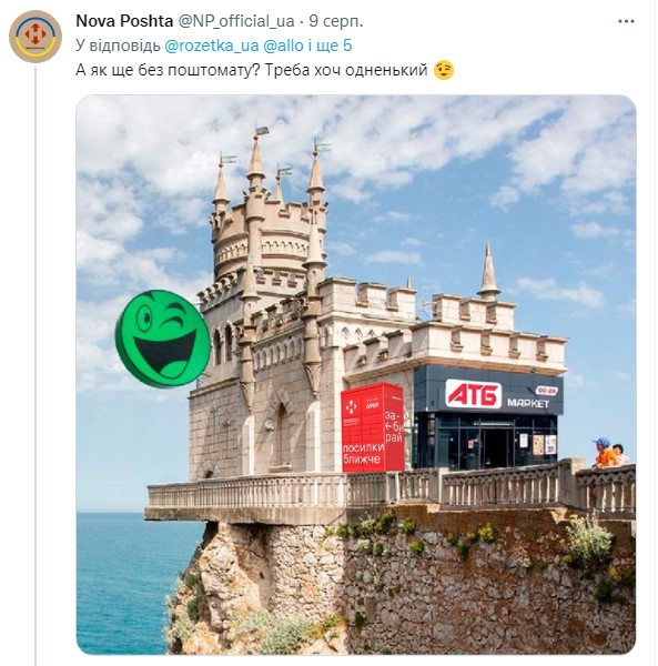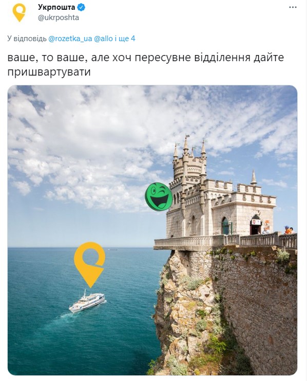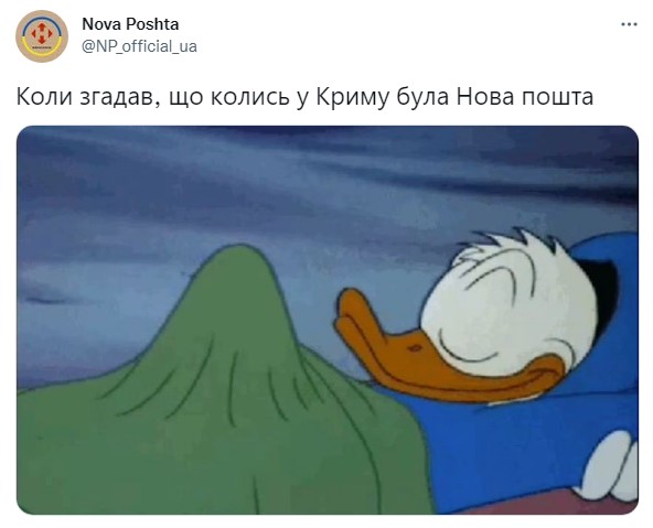 Нова пошта решила, что одной шутки недостаточно по теме, поэтому дополнительно смелым твитом вспомнила хорошее время, когда в Крыму было их отделение.