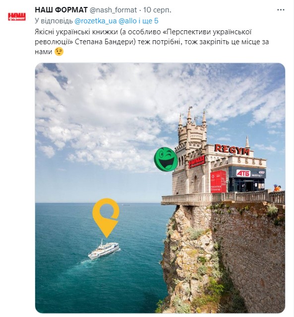 “Окей, забирайте Ласточкино гнездо, мы первыми забили место с самым большим трафиком”, – хитро отреагировали в Citrus. И установили вместо памятника Ленина скульптуру Степана Бандеры в центре Симферополя.