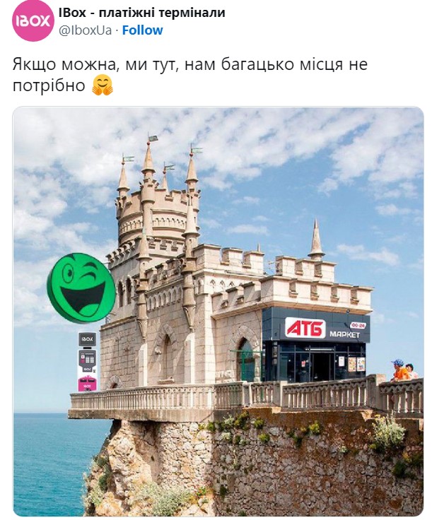 Rozetka и борщ Клопотенка на Ласточкином Гнезде, Пузата Хата в Кремле, Киевстар в Новофедоровке, а также Цитрус и Бандера, конкуренция между Reserved, iStudio и аптекой Подорожник и другие шутки по случаю первого “хлопка” в Крыму.